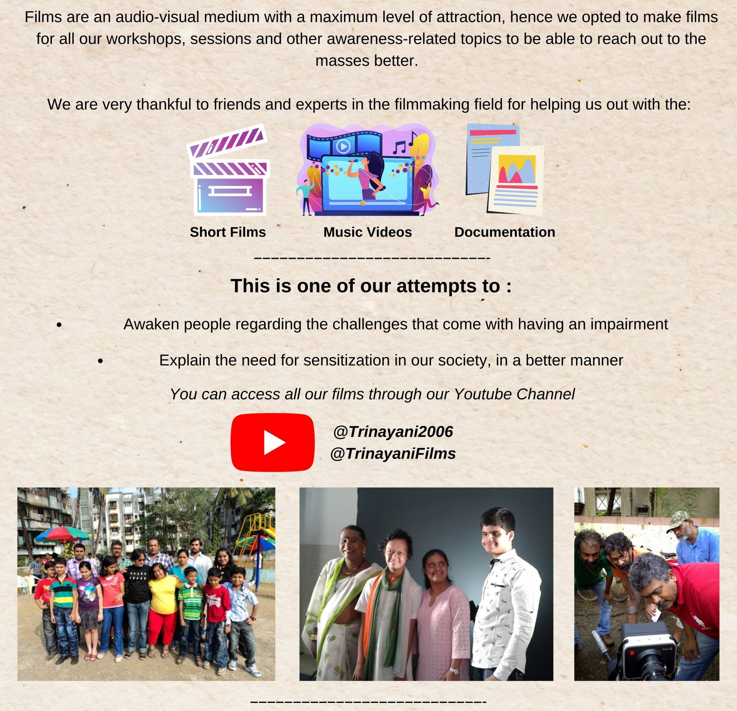 Trump Together Film Workshop Disability Awareness https://www.youtube.com/watch?v=N-ucM6B3bQg&ab_channel=Trinayanifilms