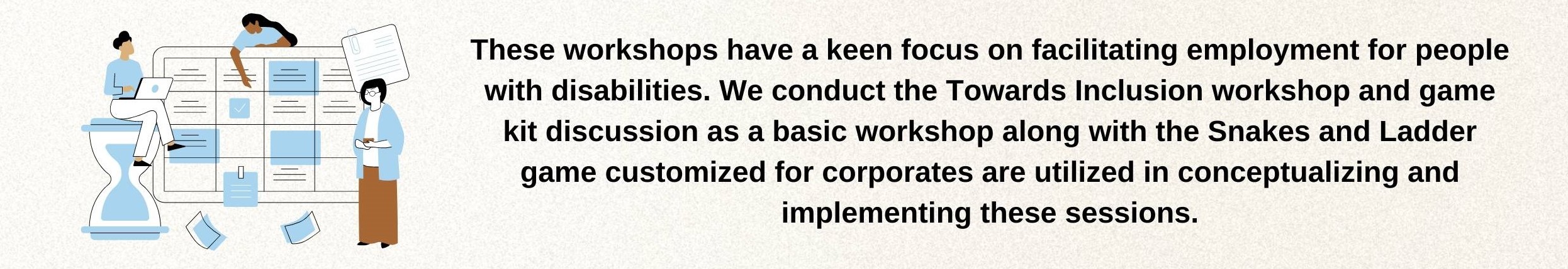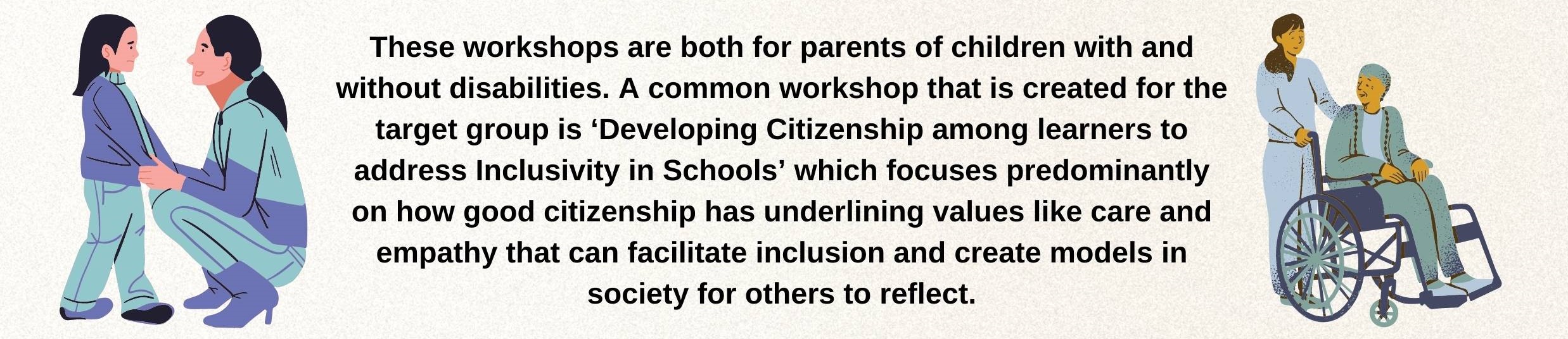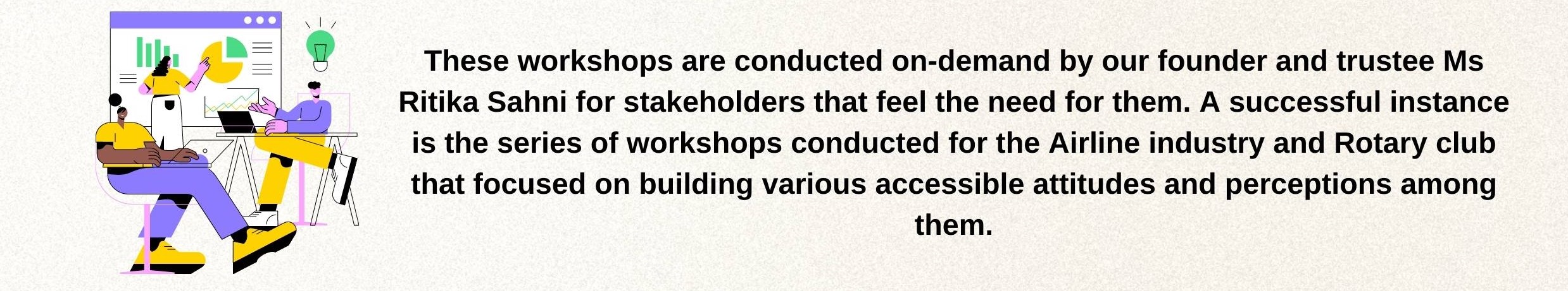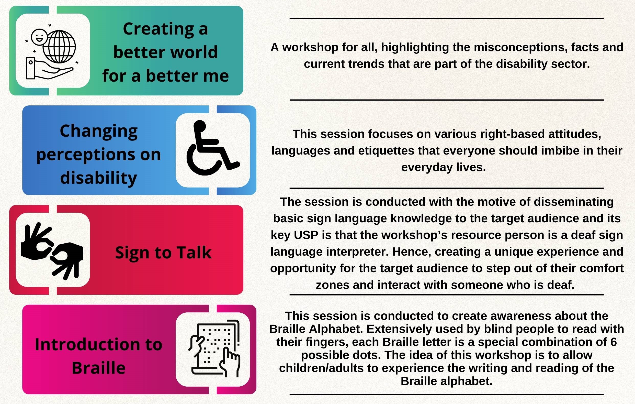 The diverse world of disability is a very significant and key concern that applies to all stakeholders. In the past few years, we have observed how the ripple of inclusion has touched upon everyone and ignited the light of the change that has facilitated many of you to reach out to us to take you on, on this journey. These sessions are a need of the hour, and we urge you to take that step with us so that as citizens our duties to our counterparts are fulfilled. Reach out to us to envisage this journey with us.