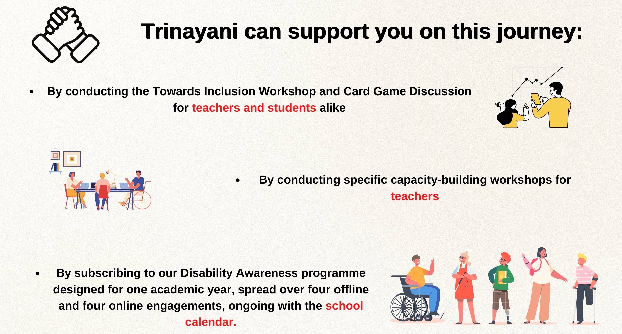 At Trinayani, we feel that disability awareness starts with all of us and benefits all of us. We need to reach out, interact, and learn more about the people we share space with, within this world. Each of us, including your school, plays a key role in facilitating this. Our games will enable the academic community to enhance empathy, make social connections with people who are different and learn not to leave anyone behind.