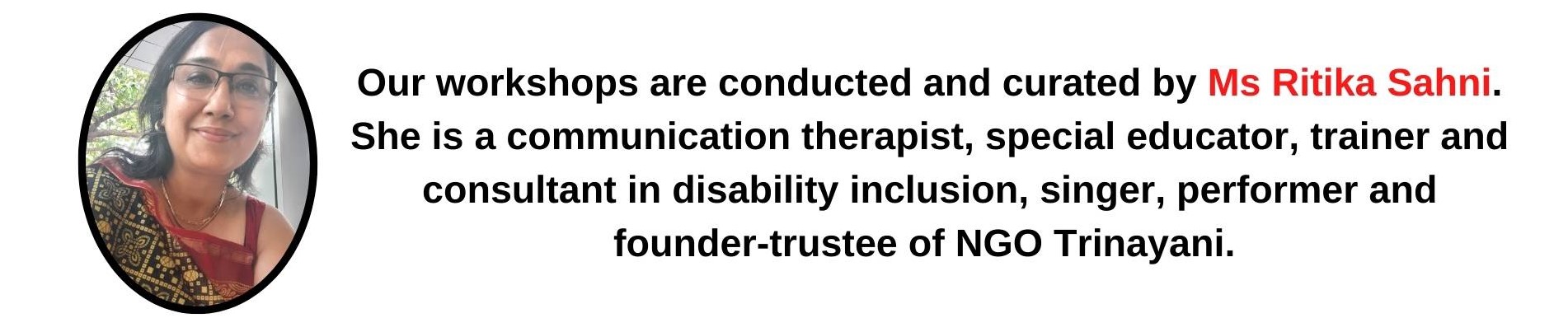 This workshop is for the public in general on basic attributes and aspects of the world of disability that every person must be aware of and learn more about. Trinayani has been conducting these in various forms, namely:
