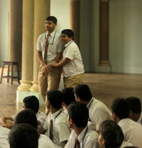 The questions regarding assisting a blind person led to demonstrations on Disability Etiquette as to what to keep in mind when escorting blind persons. Volunteers from the participating audience helped in the demonstration. The usual fumbles occurred wherein Romit, the student who was to guide the Keval, ( asked to take on the role of a blind person) put his arm around his shoulder and led him to where he needed to go. Ritika then went on to show the correct way to escort a blind person. She also showed how and why Romit had gone wrong, asking a female volunteer to come up to further explain how putting an arm around someone would be going into their personal space. Much hilarity ensued as Ritika demonstrated what not to do along with what should be done.