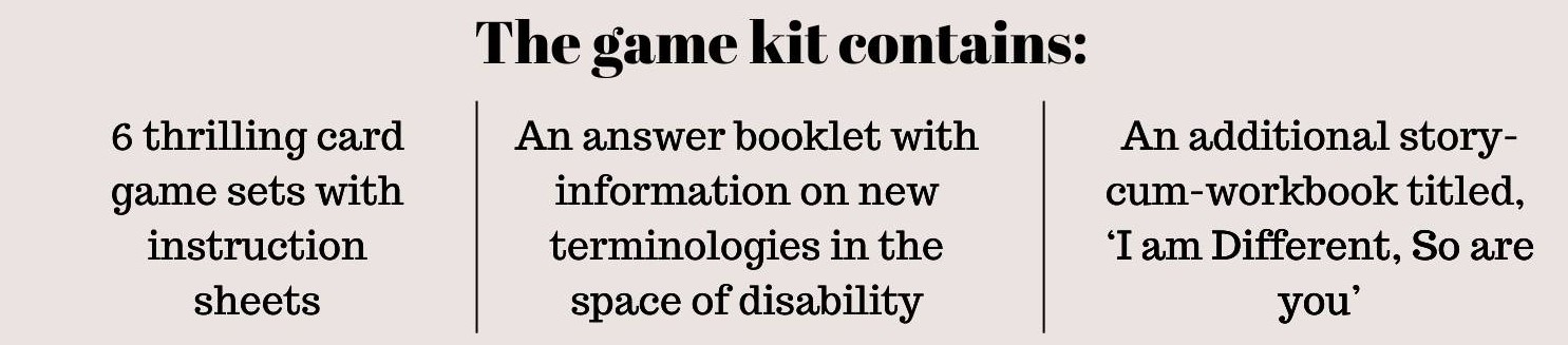 | 4. | Barriers Begone! – Card game akin to RUMMY | Enables recognition of various barriers for the disabled community, and solutions for it |