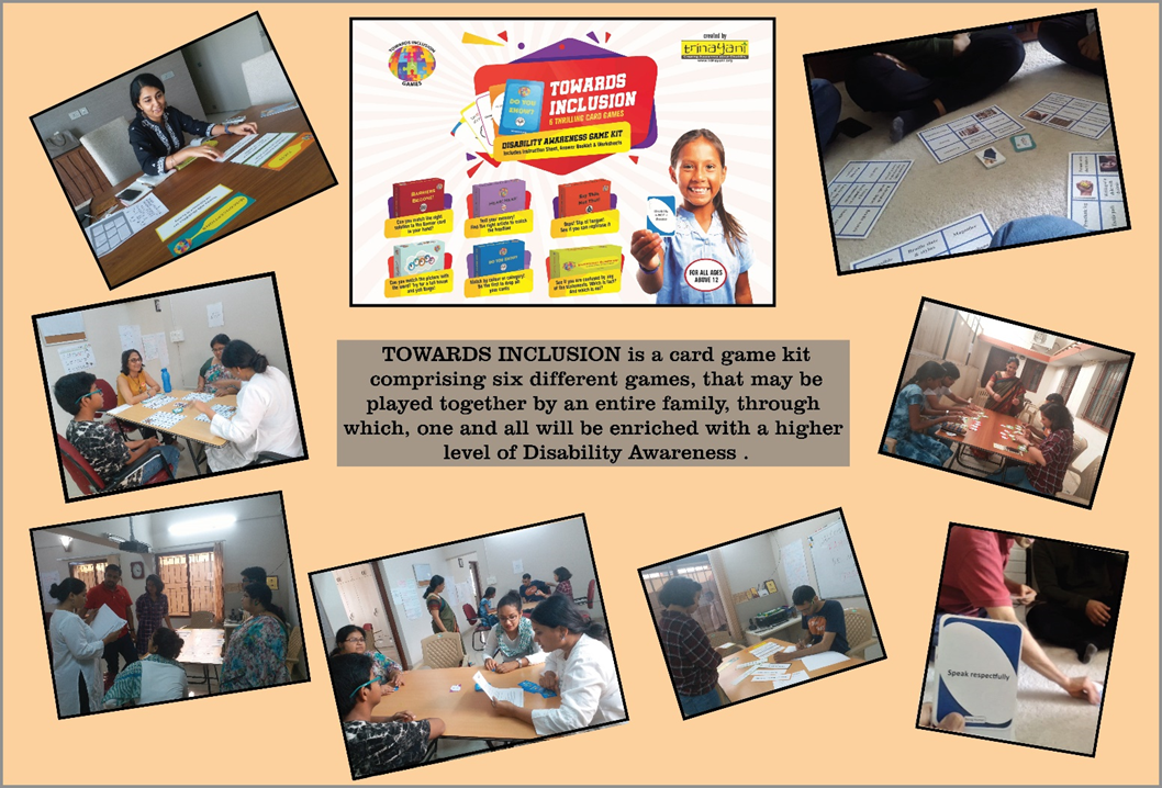 We believe, that the schools of the future will be truly inclusive with a diversity of all kinds including disabilities amongst students as well as the teaching cadre. Since the essence of what we do at Trinayani, lies in educating the masses, we firmly believe this is something that must be embedded into formal education. And so, in March 2020, we launched our TOWARDS INCLUSION DISABILITY AWARENESS GAME KIT. Developed by Ritika Sahni, Trainer, Disability Inclusion Consultant, NGO Trinayani, Mumbai and Padma Shastry, Inclusive Education Specialist, Samam Vidya, Bangalore, the Game kit includes, 6 thrilling Card Games, a Workbook and an Answer booklet.